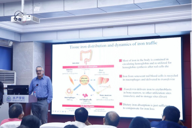近日,我们2025年第07期(总420期)“水产讲坛”在水产楼A座201报告厅举行,特邀Kostas Pantopoulos教授作专题学术报告,报告题目为“Systemic iron metabolism in health and disease: Lessons from mouse models”。Kostas Pantopoulos教授主要以小鼠为模型,介绍他实验室在个体水平的铁代谢及其调控领域的研究成果,为理解铁元素的生理功能及其相关病理模型中的铁代谢调控特征提供了新的视角。本次讲座由水产动物分子营养方向的罗智教授主持。