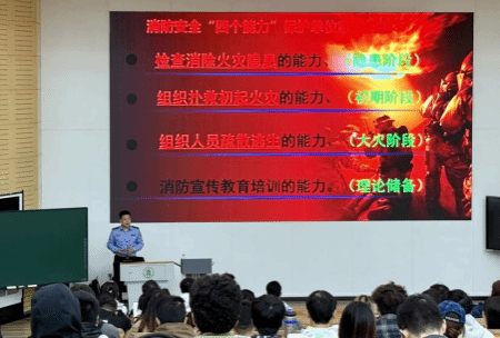 讲座开始前,吴飞越教官播放了消防宣传视频。随后,他从消防安全“四个能力”分别进行了宣传及培训,包括检查消除火灾隐患、组织扑救初起火灾、组织人员疏散逃生、消防宣传教育培训四个不同阶段的能力。吴飞越以典型火灾案例为基础,通过触目惊心的事故现场照片与视频、详尽的数据,深刻剖析了电动车违规进楼充电、老旧插排超功率等多个火灾案例发生的原因及危害,使同学们直观地了解到火灾发生的突发性与破坏性。“除了火灾的扑救,检查与消除潜在的火灾风险尤为重要。”吴飞越结合437437必赢国际网址实验室水产养殖设备密集、用电负荷较高的专业特点,重点讲解了电器火灾预防、易燃试剂存储等针对性安全知识,并教学使用火灾报警器、灭火器、消火栓等多个消防设施。