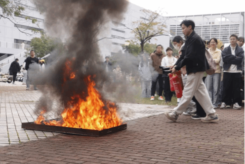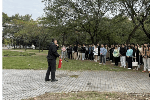 理论讲座结束之后,全体人员移步至水产楼A座门前广场进行消防实操培训。在模拟火灾现场,教官手持灭火器实物,拆解演示了 “提、拔、握、压”四字操作口诀,强调 “瞄准火源根部喷射”的核心要领,并提醒大家注意站在上风方向、保持安全距离等操作规范。随后,同学们分组轮流实操,在专业指导下亲身体验灭火器使用流程。从提起灭火器、拔掉保险销到对准模拟火源按压喷射,整个操作过程有条不紊,大家认真体会每一个动作要领,直至成功扑灭明火。现场安全员全程监护,确保实操培训安全有序进行。
