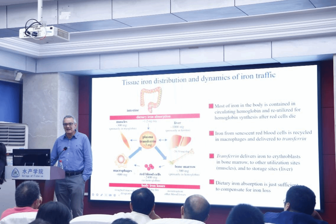 近日,我们2025年第07期(总420期)“水产讲坛”在水产楼A座201报告厅举行,特邀 Kostas Pantopoulos 教授作专题学术报告,报告题目为“Systemic iron metabolism in health and disease: Lessons from mouse models”。Kostas Pantopoulos 教授主要以小鼠为模型,介绍他实验室在个体水平的铁代谢及其调控领域的研究成果,为理解铁元素的生理功能及其相关病理模型中的铁代谢调控特征提供了新的视角。本次讲座由水产动物分子营养方向的罗智教授主持。